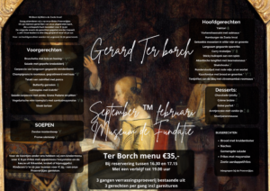 Van september tot en met februari heeft Museum de fundatie de expositie over "Gerard Ter Borch". Deze 17e eeuwse schilder heeft prachtige werken gemaakt die de moeite waard zijn te bezichtigen. Speciaal voor deze expositie hebben wij een "Ter Borch Actie". U ontvangt een 3 gangen proeverij menu waarbij onze chef per gang 3 heerlijke gerechten heeft samen gesteld.